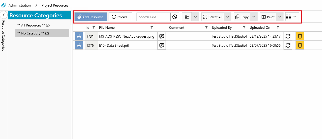 All uploaded resources are displayed in the main grid. The control bar actions interact with this grid for managing and exporting resource data.