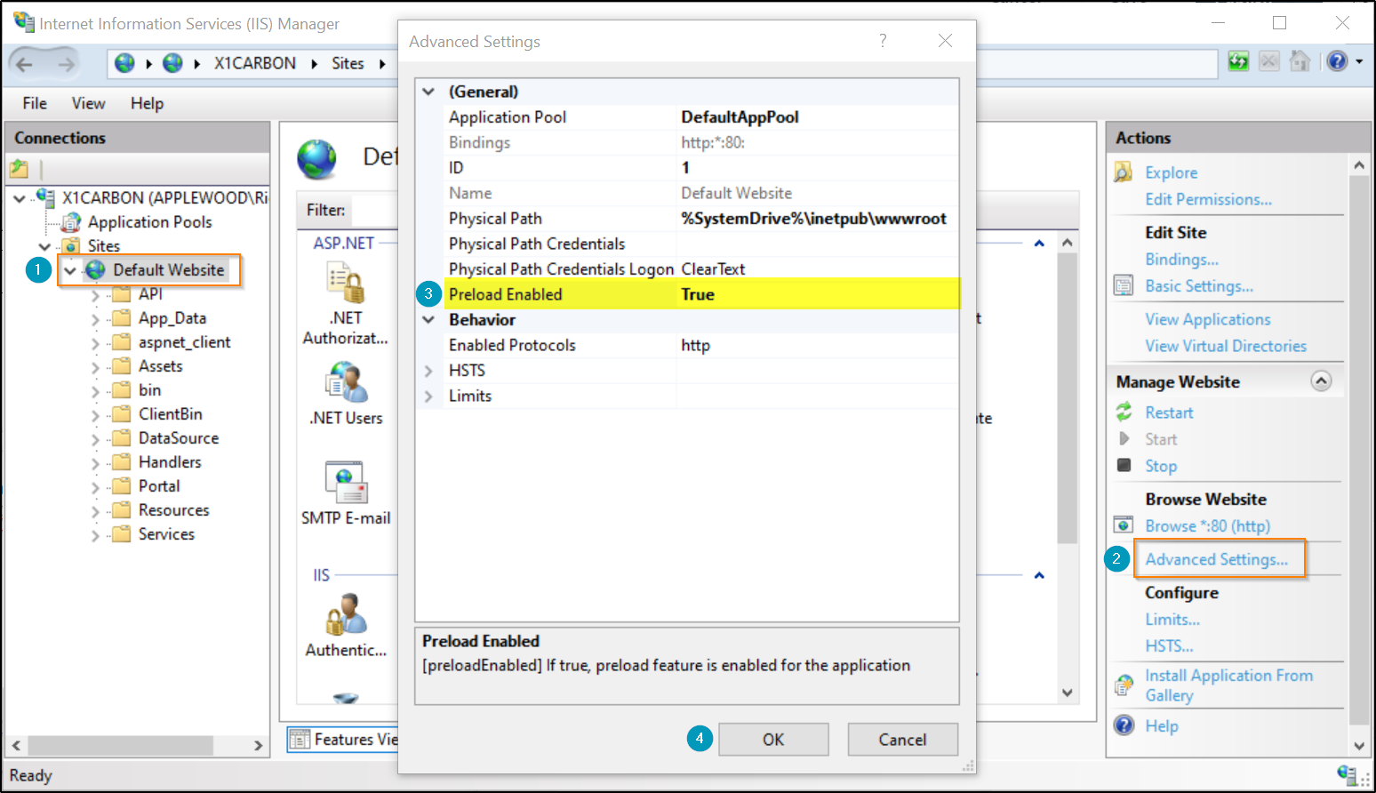 Start ModetoAlwaysRunningandIdle Time-outto0. - Set Application Pool recycling time outside working hours.