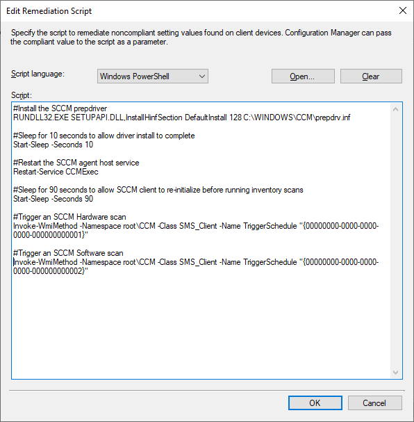The script installs the Prep Driver from the local CCM folder on the client, pauses for 10 seconds to allow the installation to complete, and then restarts the CCMExec service. After re-initialisation, a hardware and software scan is triggered.