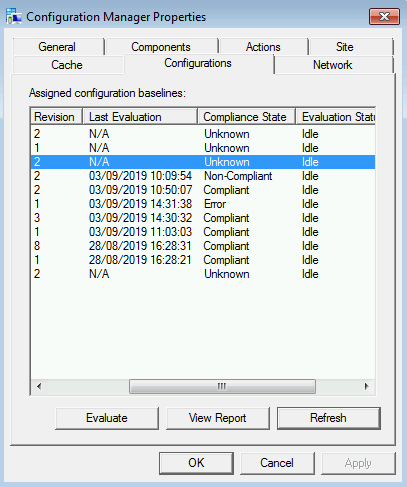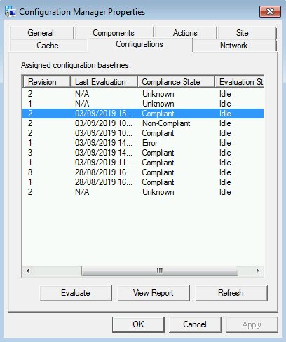 After deploying the Compliance Baseline, it will appear in the 'Configurations' tab of the SCCM client properties. Execution occurs based on the set schedule. Once complete, the 'Compliance State' status should change from 'Unknown' to either 'Compliant' or 'Non-Compliant':