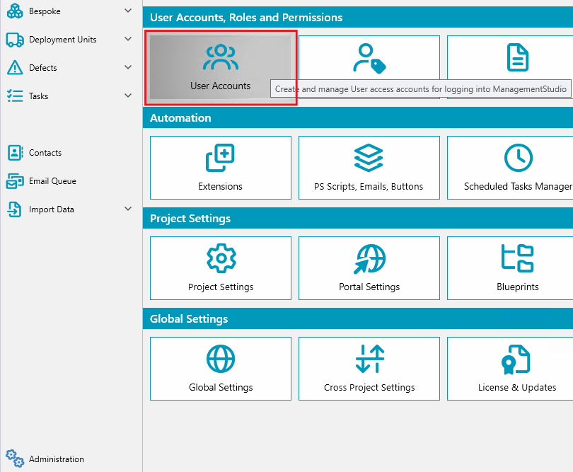 Administration → User Accountsin the User Accounts, Roles and Permissions section.