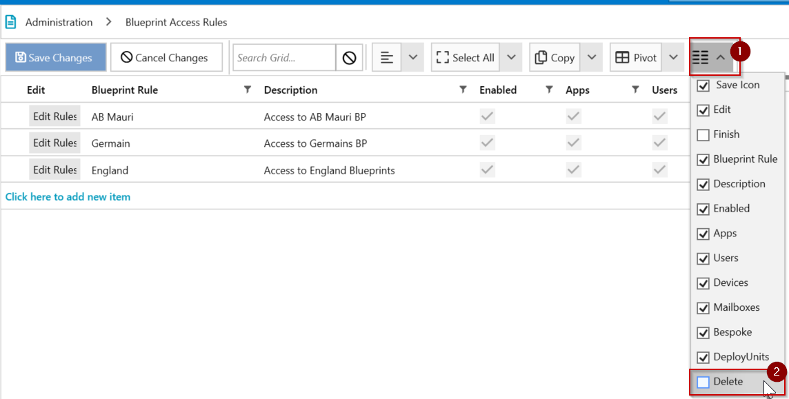 Deletecolumn, tick the checkbox next to the blueprint rule(s) you wish to delete. - Click