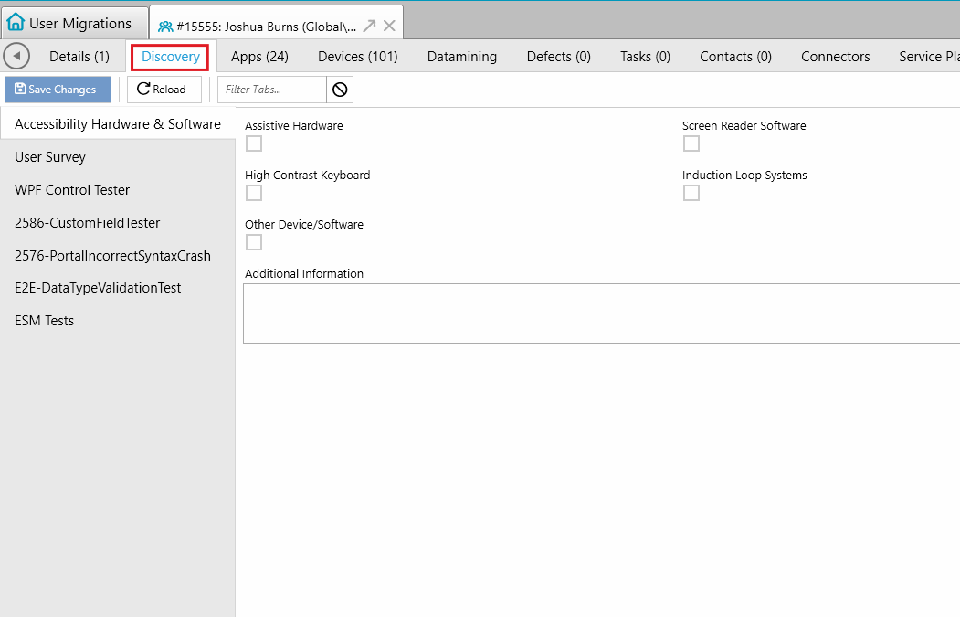 The Discovery tab in ManagementStudio allows administrators to capture additional information for any object within a module. This functionality supports planning and migration tasks by enabling the creation of custom data fields. For example, during a mobile phone migration, you might use custom fields to record a user's manufacturer preference or required accessories.