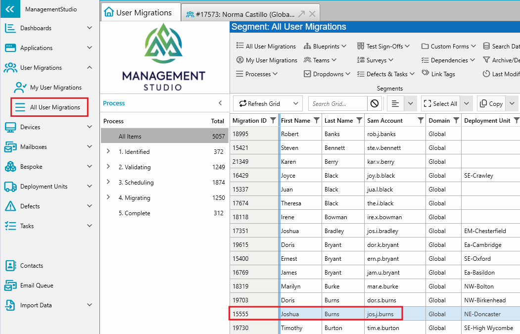 This article uses the User Migrations module as an example. The processes described also apply to other modules, including Applications, Devices, Deployment Units, Mailboxes, and Bespoke Modules.