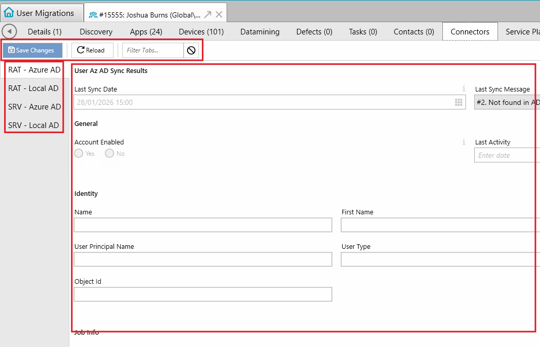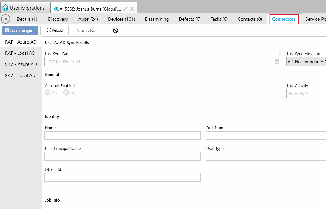 Example: The Connector Area displaying Active Directory (AD) connector data for a User Migration record.