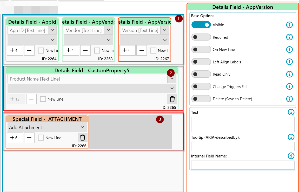| Required | Read Only | Change Triggers Fail | Visible | On New Line | |