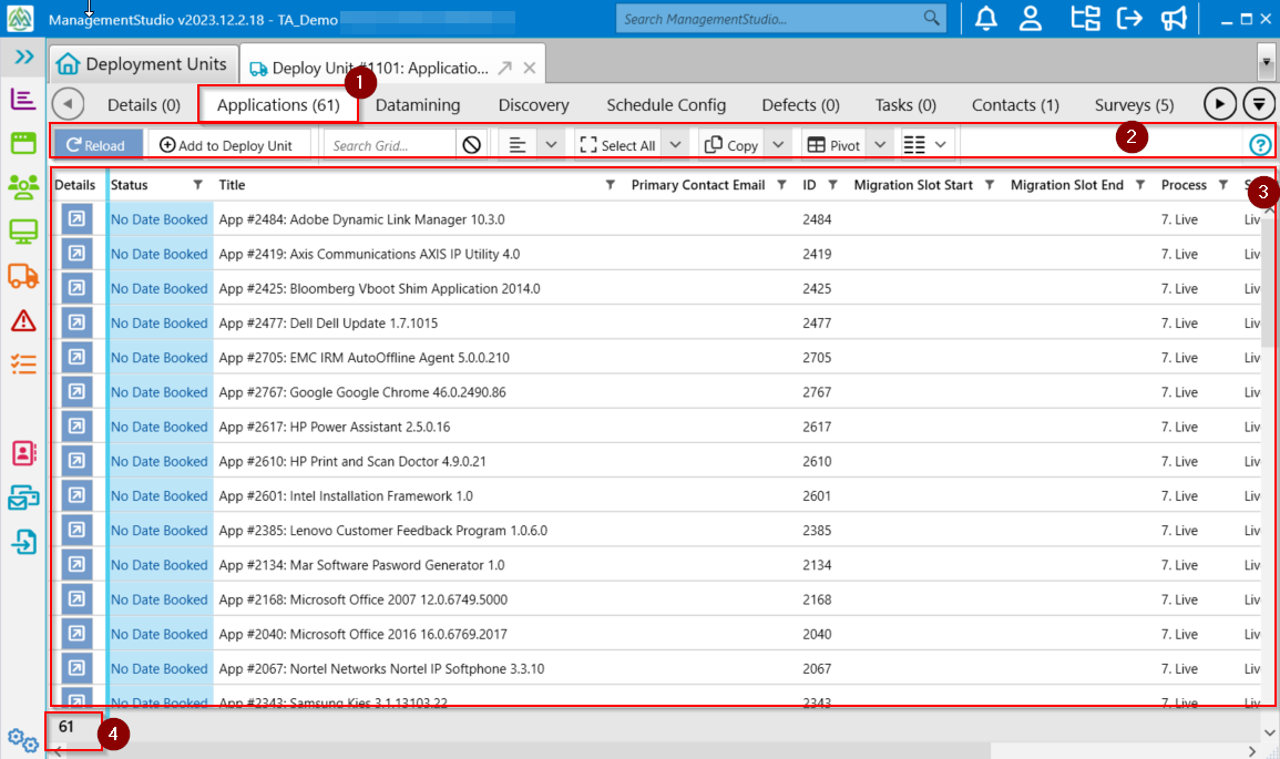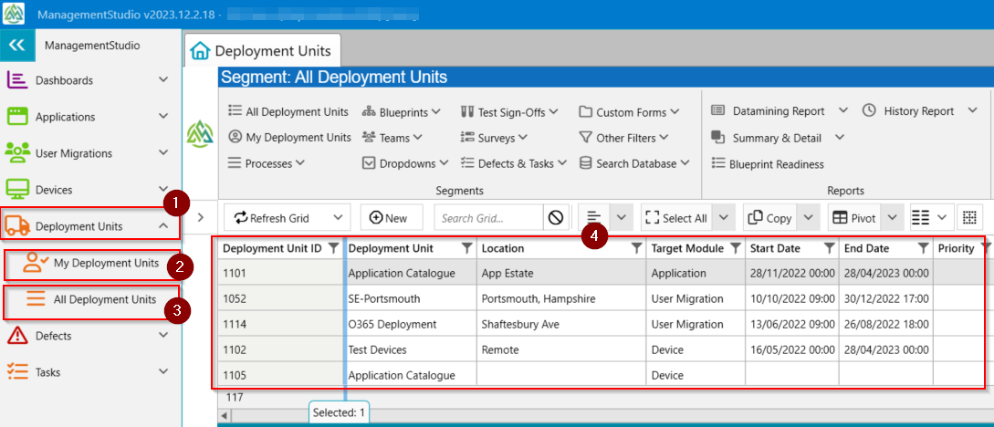 - Double-click a deployment unit in the main grid to open its details panel (4).
