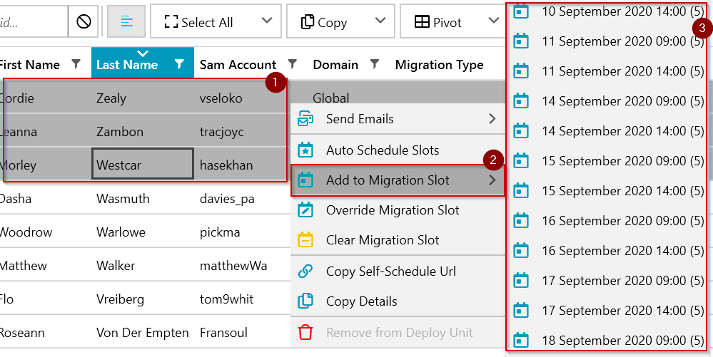 Add to Migration Slot | Assigns selected users to a specific migration slot; does not overbook or overwrite existing slots. |