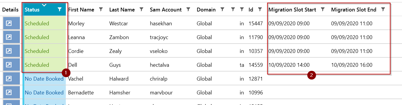 DetailsStatus(user’s scheduled status)First NameLast NameSam AccountDomainMigration TypeEmailIdMigration Slot StartMigration Slot End