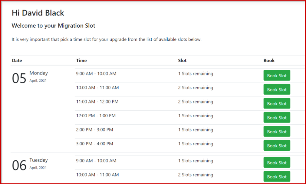- Users follow the link to the web portal, view available migration slots, select a slot, and confirm.