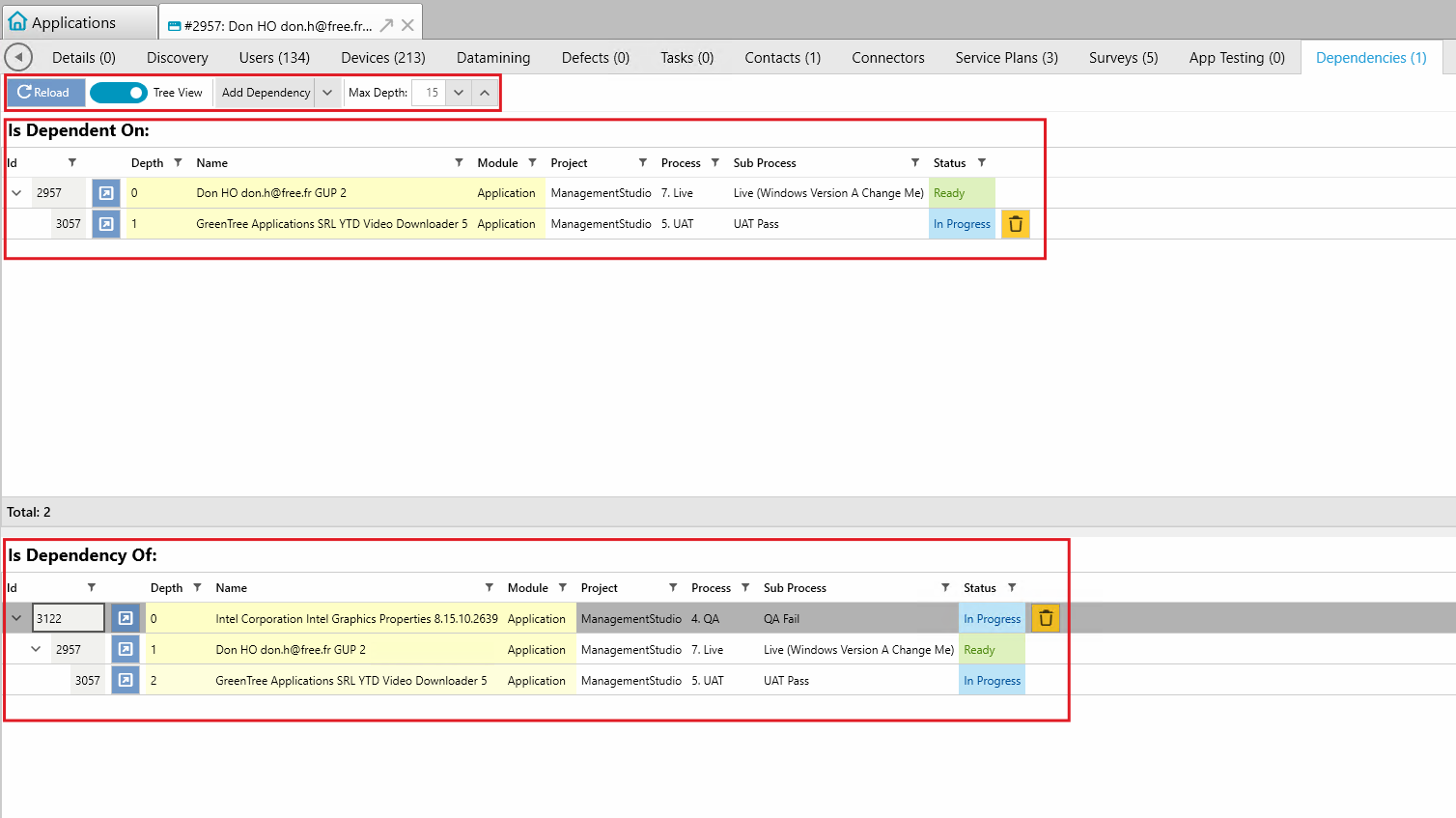 - The hierarchical structure in Tree View and the relational data in these grids allow you to trace dependencies both upwards (what is required for this item) and downwards (what depends on this item).