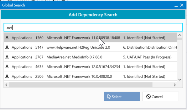 Add Dependency. - The Add Dependency dialog allows searching across all object types within the chosen project.