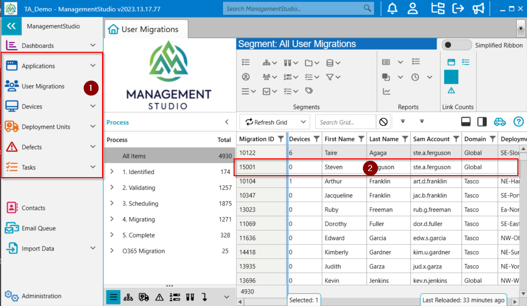 - Choose the relevant module from the vertical menu bar on the left (1), in this example, User Migrations, and double click click an item from the User migration grid (2) to open the details panel.