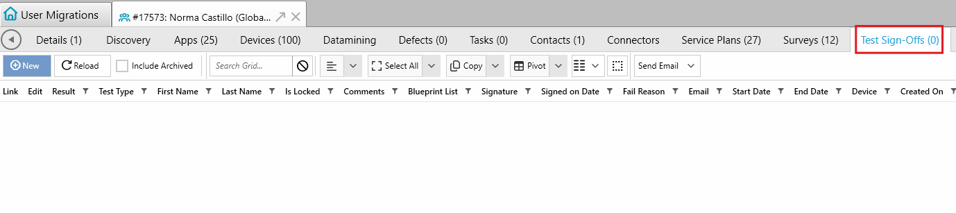 - Test Sign-Offs main grid: Displays test sign-off records.