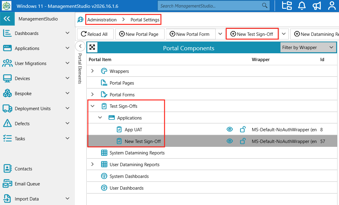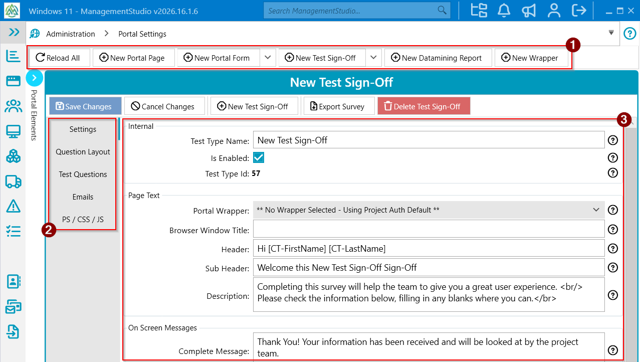 Administration→Portal Settings→Test Sign-Offs. - In the Portal Elements tree view, select an existing Test Sign-Off or click