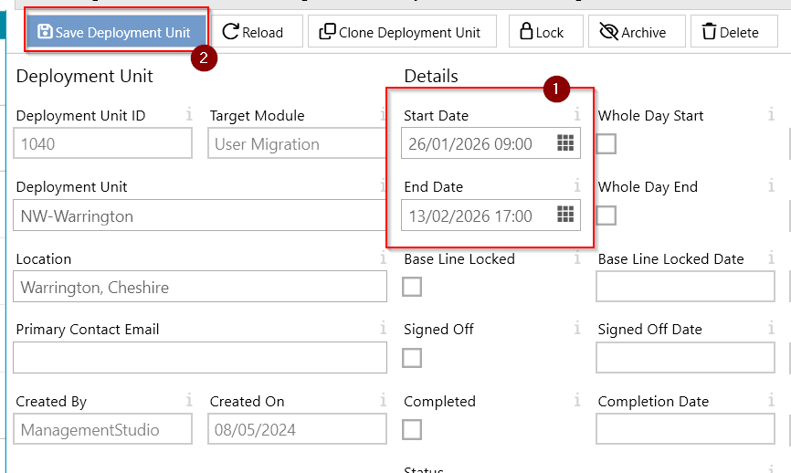 Start DateandEnd Datefor the 3-week migration window (1). For example, set the start at 09:00 on 26/01/2026 and the end at 17:00 on 13/02/2026. - Click