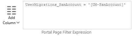 - In the Datamining report, add a Portal Page Filter Expression as follows: UserMigrations_SamAccount = '[UM-SamAccount]'