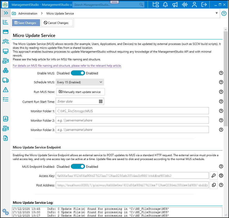 - MUS Endpoint requires ManagementStudio version 2026.16.1.1 or higher.