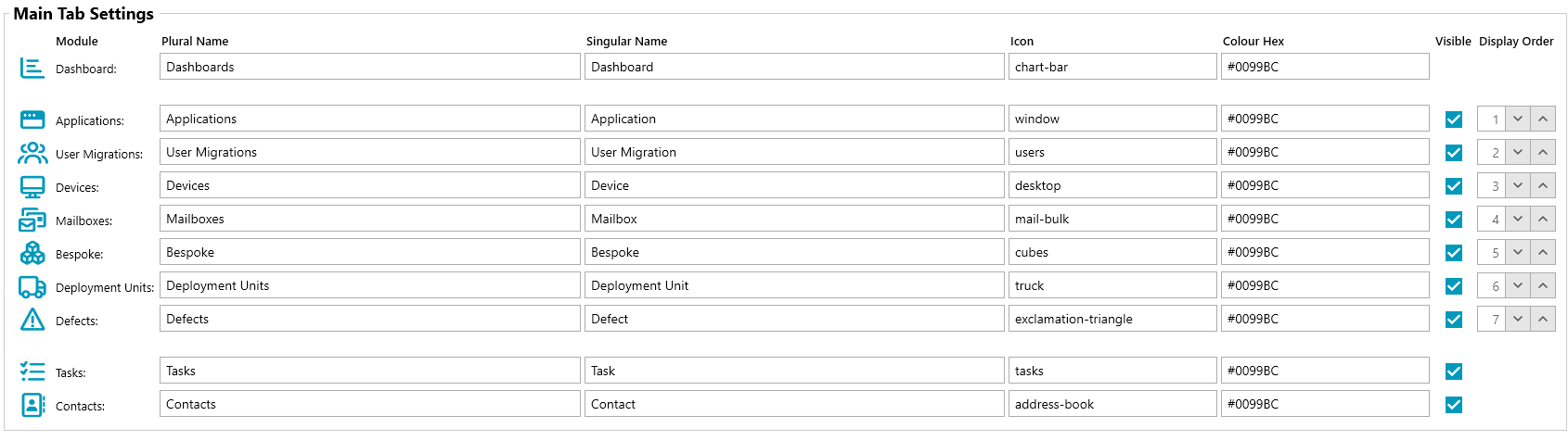 Define which modules (buttons) are visible within the project and their order, labels, icons, and colours.