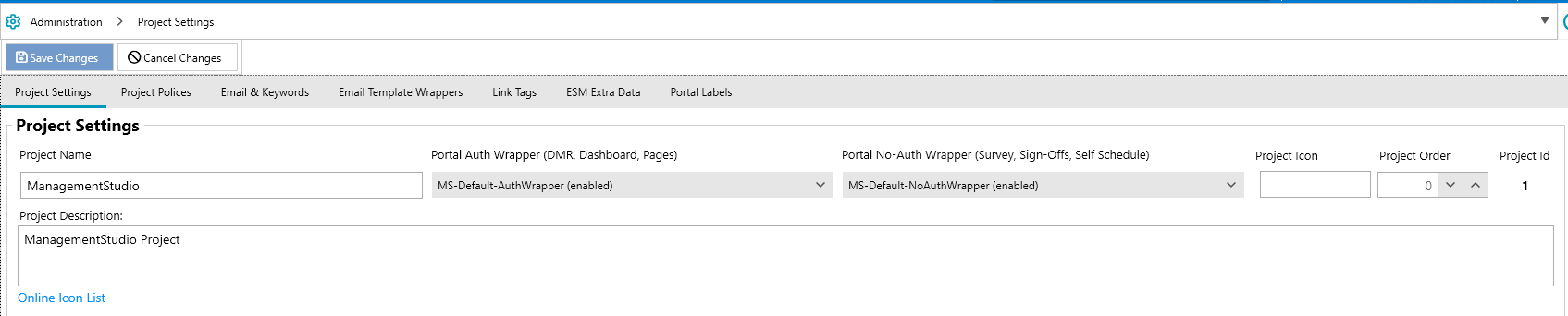 The Project Settings page in ManagementStudio provides centralised configuration for project-specific options, including general settings, email templates, housekeeping, and portal localisation. Only users with project admin permissions can view and access the Project Settings page.