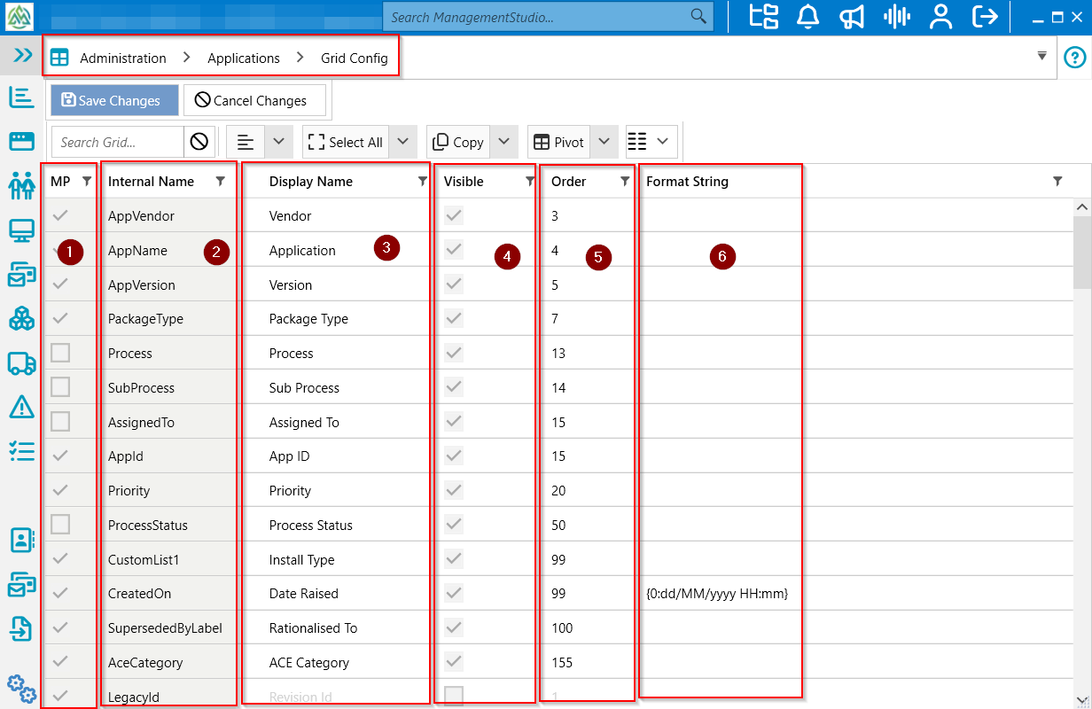 The Grid Config section in each ManagementStudio module allows administrators to define the properties and structure of the grid view. This article uses the Applications module as an example; however, the configuration principles apply to all modules within ManagementStudio.