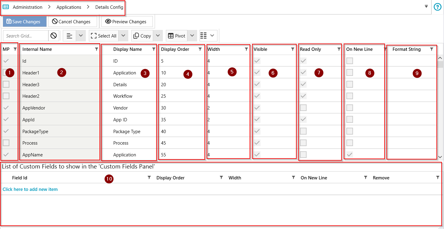 The Details Config section within each module in ManagementStudio allows administrators to define the properties and structure of elements displayed in the module's Details tab. This article uses the Applications module as an example, but the same principles apply to all modules in ManagementStudio.