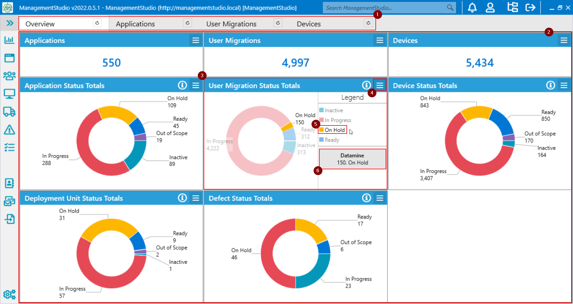 ManagementStudio's Dashboards provide an interactive way to view key project information and trends. Dashboards may display metrics such as application rationalization progress by department, the number of users migrated, or devices that failed hardware compatibility checks. They are customizable and shareable, with many widgets allowing for deeper exploration of data.