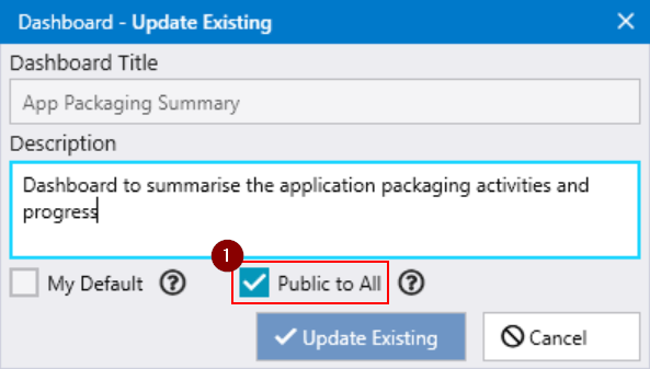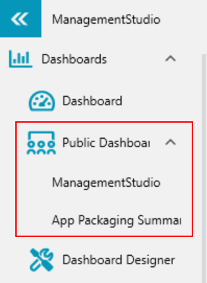 Dashboards can be shared with other ManagementStudio users by selecting the Public to All option when saving or updating a dashboard.