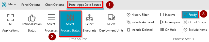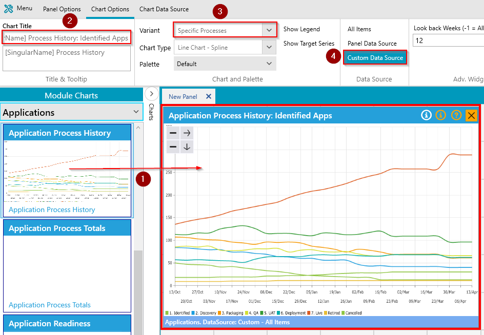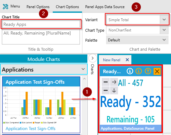- Drag the All, Ready, Remaining Applications chart onto the panel (1).