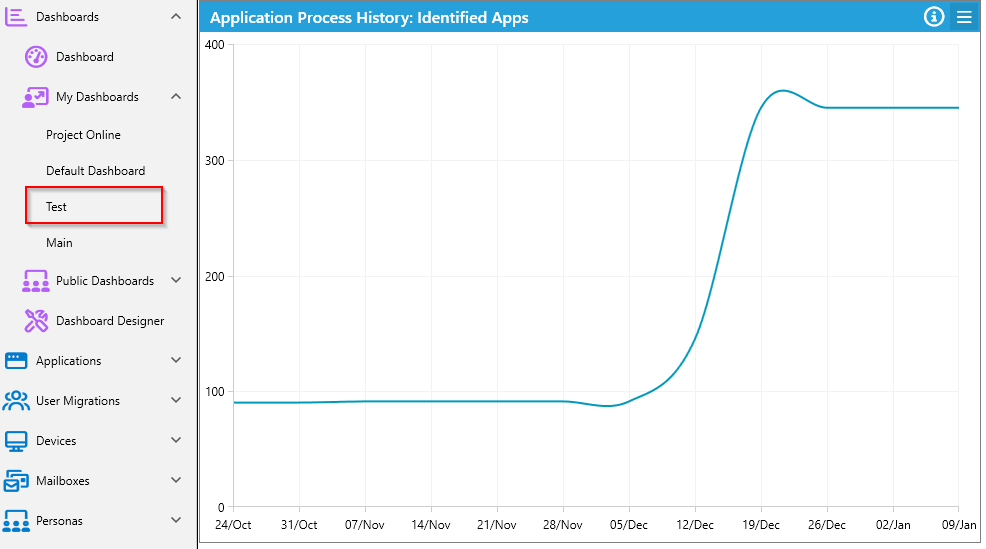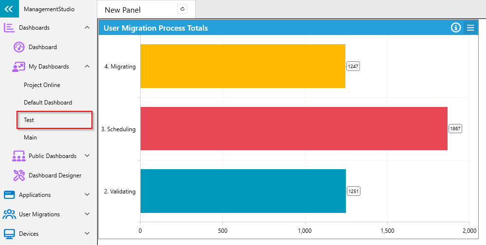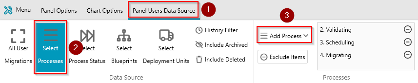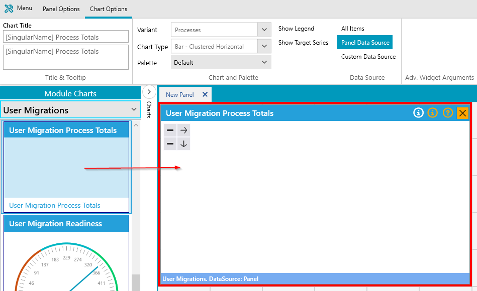 - Drag the User Migration Process Totals chart onto the panel (1).