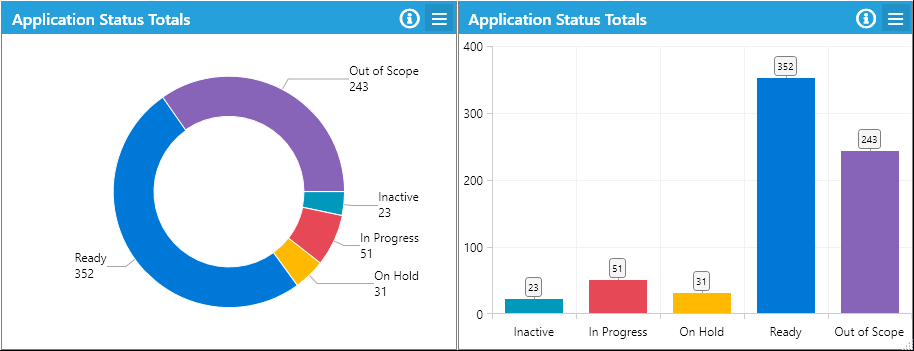 The Status Totals widget displays a real-time count of records (such as Apps, Users, Devices) grouped by their current Process Status. Unlike the Process Totals widget, which groups by Process, this widget focuses on the Process Status (sometimes referred to as "readiness"), providing a concise view of project progress. Process Statuses are assigned to each process and can be one of the following: