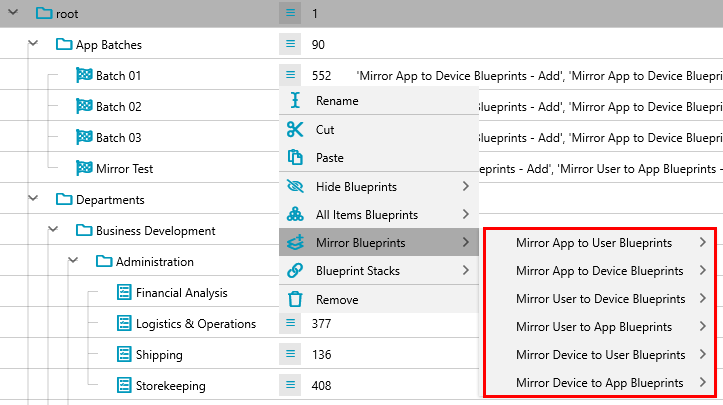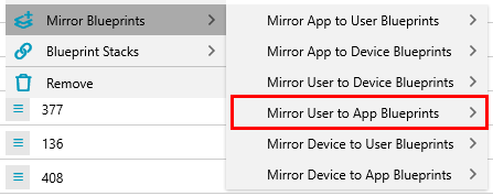 Blueprint Mirroring allows you to automatically reflect Blueprint membership between related items, such as users, applications, and devices. This feature helps maintain accurate Blueprint groupings when item relationships change.