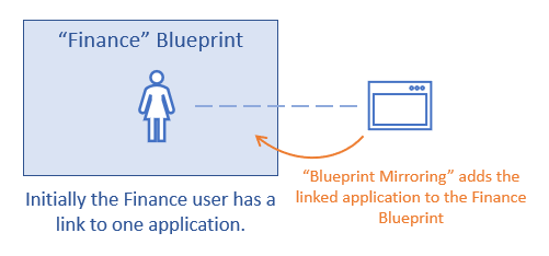 A user in the Finance department is added to the Finance Blueprint. The user is linked to an application. With Blueprint Mirroring enabled, the application is automatically added to the Finance Blueprint. This allows you to view all applications used within the Finance department using the Blueprint filters.