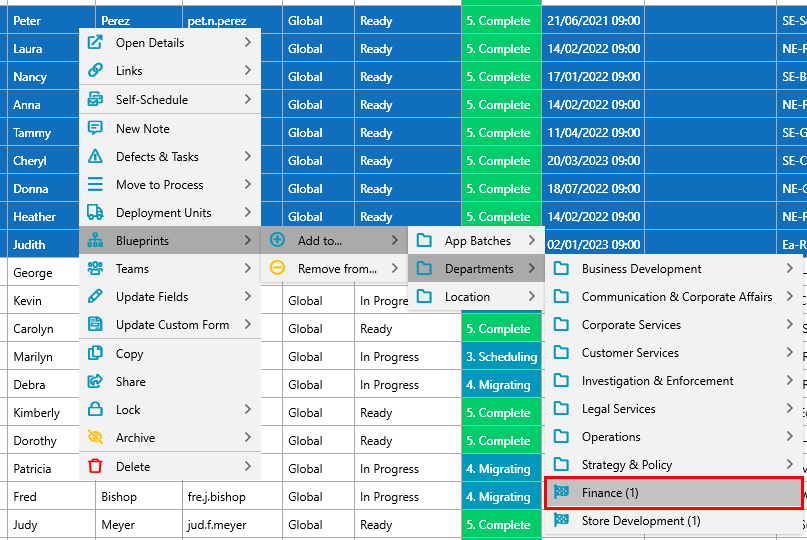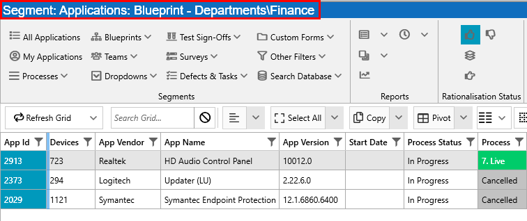 Blueprintsdropdown from theSegmentsribbon:Blueprints → Departments → Finance