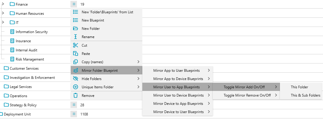 Mirror Folder Blueprint → Mirror User to App Blueprints → Toggle Mirror Add On/Off → This Folder.To remove mirroring, use