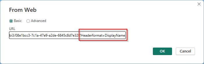 - (Optional) In order to format the column headers in the Power BI report, Headerformat settings can be appended to the URL: