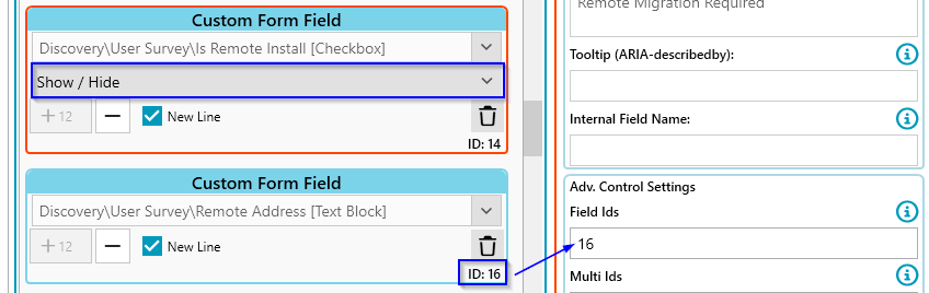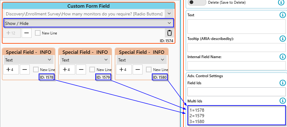 - Put the IDs of the dynamic fields into the Multi Ids panel of the Radio Button
