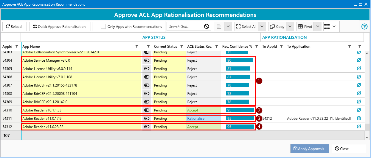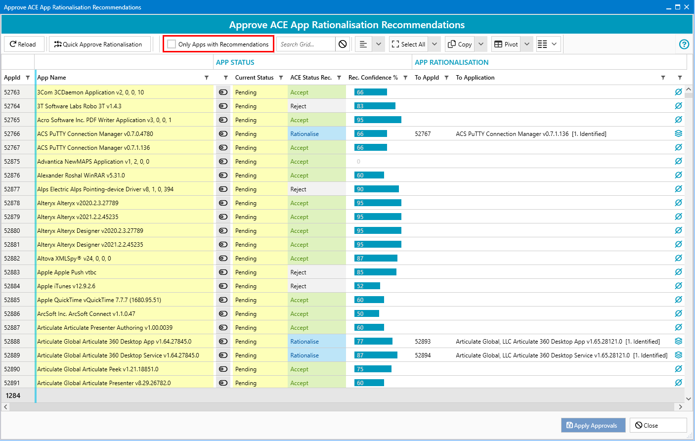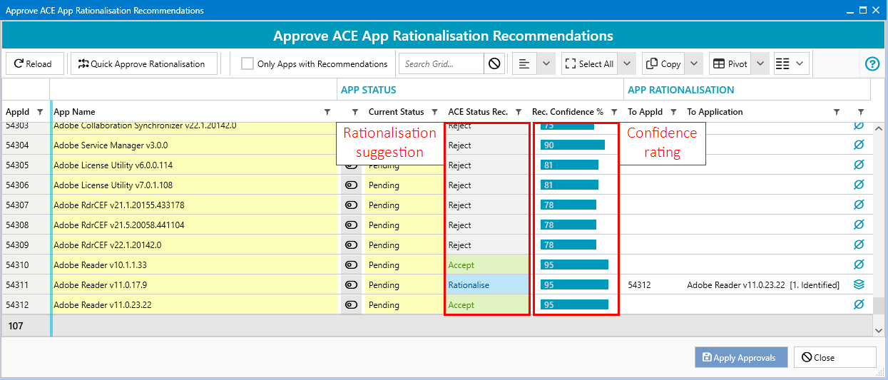 - A window will display rationalisation suggestions in yellow, along with confidence ratings based on decisions made by other ManagementStudio users.