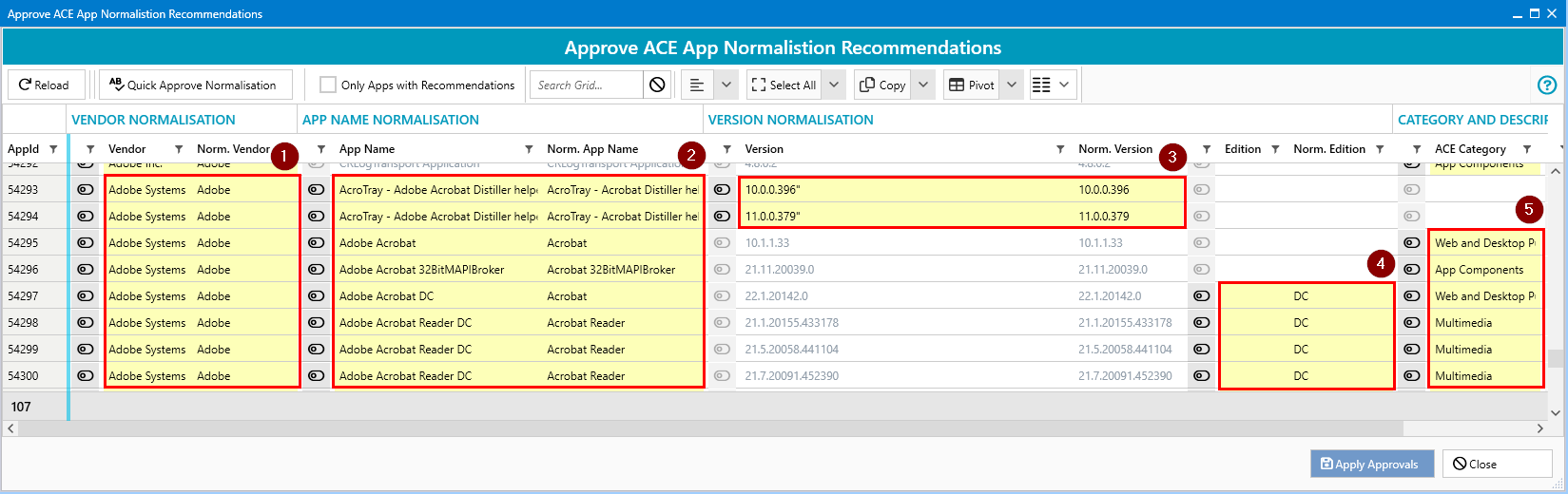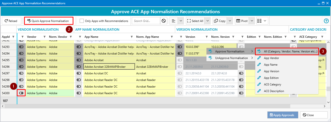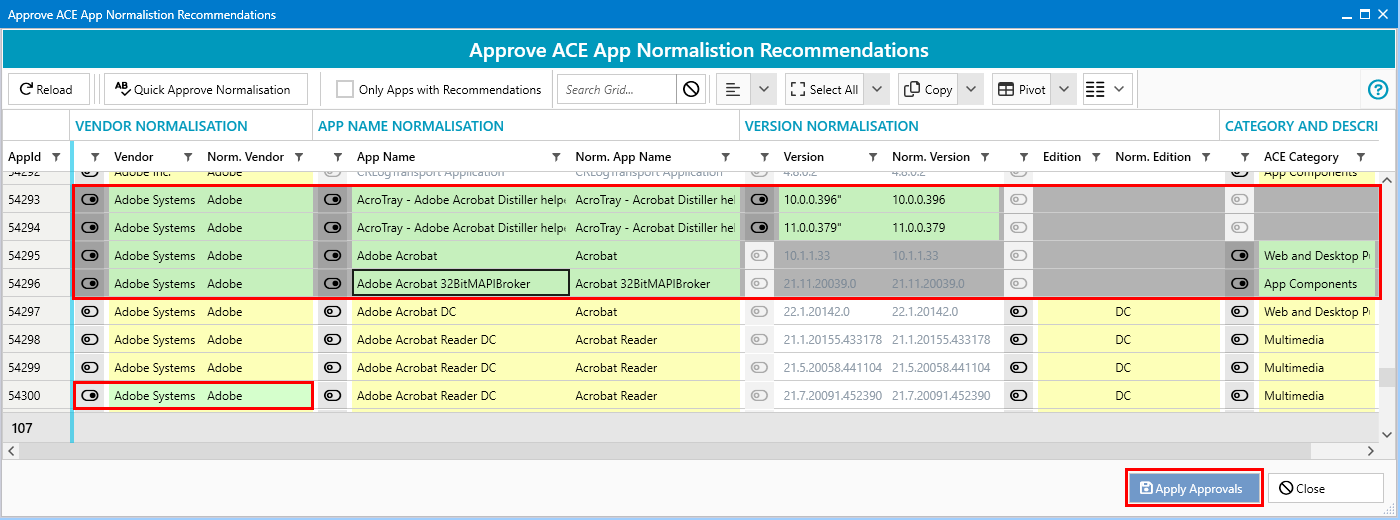 Approve Normalisation→Allfor further options. - Approved items are highlighted in green.