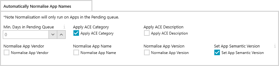 | Normalise App Name | When the button Run ACE Examination Now is clicked (or is run on a schedule) the application names will be normalised (assuming the app passes the Days in Pending Queue filter). Example: If the name contains the vendor or version, these are removed from the app name to avoid the app name being “Adobe Adobe Reader 11 11.2”. |