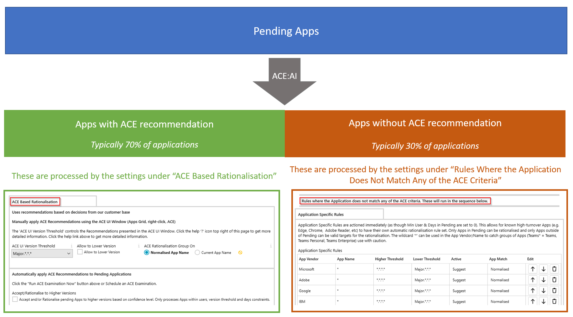 Applications which have been processed by other customers will have an ACE recommendation. Those which haven't won't. The figure below shows how these applications are handled and which settings & rules will be applied.