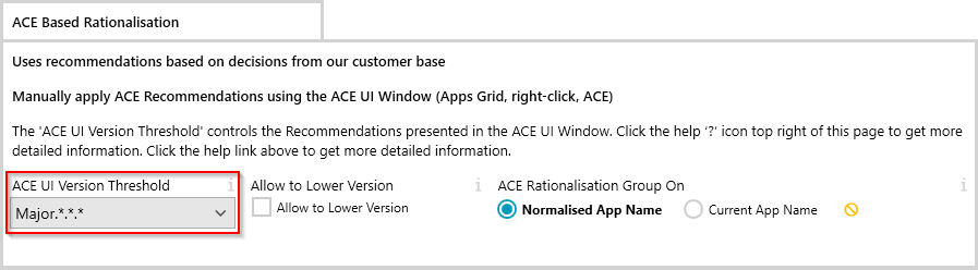 The ACE UI Version Threshold controls the recommendations presented in the ACE:AI window. For example, the default setting of Major.*.*.* will recommend rationalising all 11.x records of this application to the highest 11.x version: