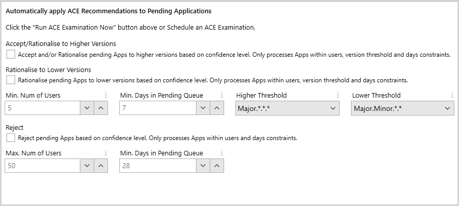 When the button Run ACE Examination Now is clicked, or is run on a schedule, the settings in this section will be used to automatically rationalise the applications. Note that this will only be performed on the Pending applications.