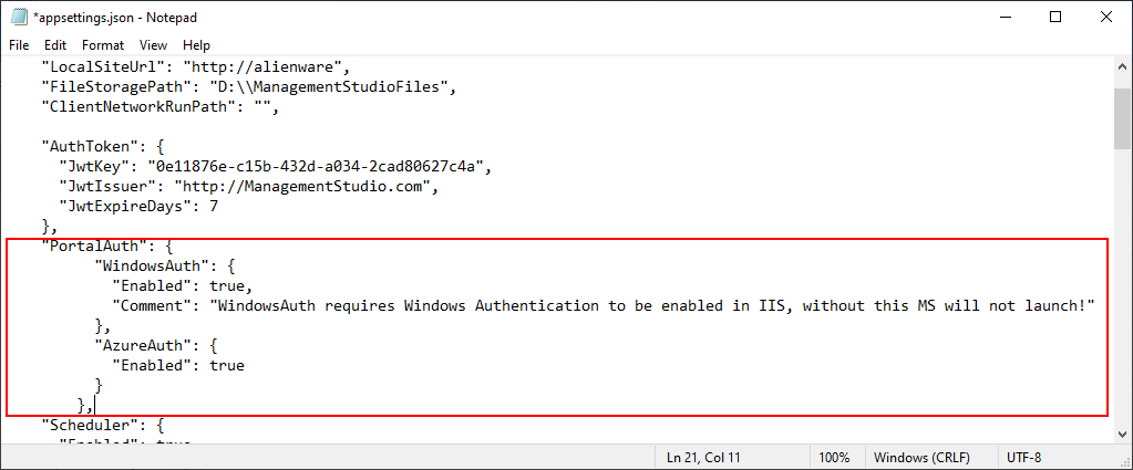 "Comment": "WindowsAuth requires Windows Authentication to be enabled in IIS, without this MS will not launch!"