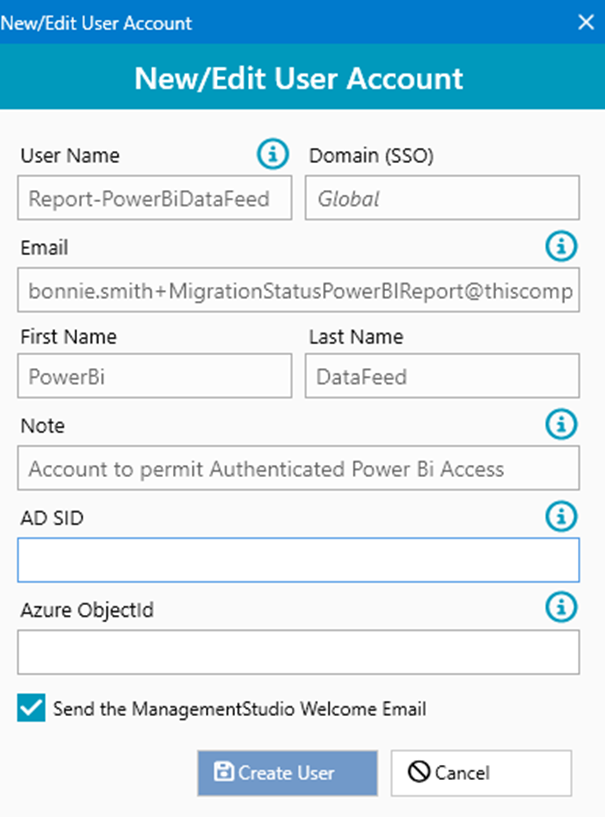 When adding a new user account in ManagementStudio, the following fields are required: