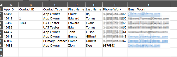 | Application ID | Contact ID | Contact First Name | Contact Last Name | Contact Email | Contact Type | Other Fields |