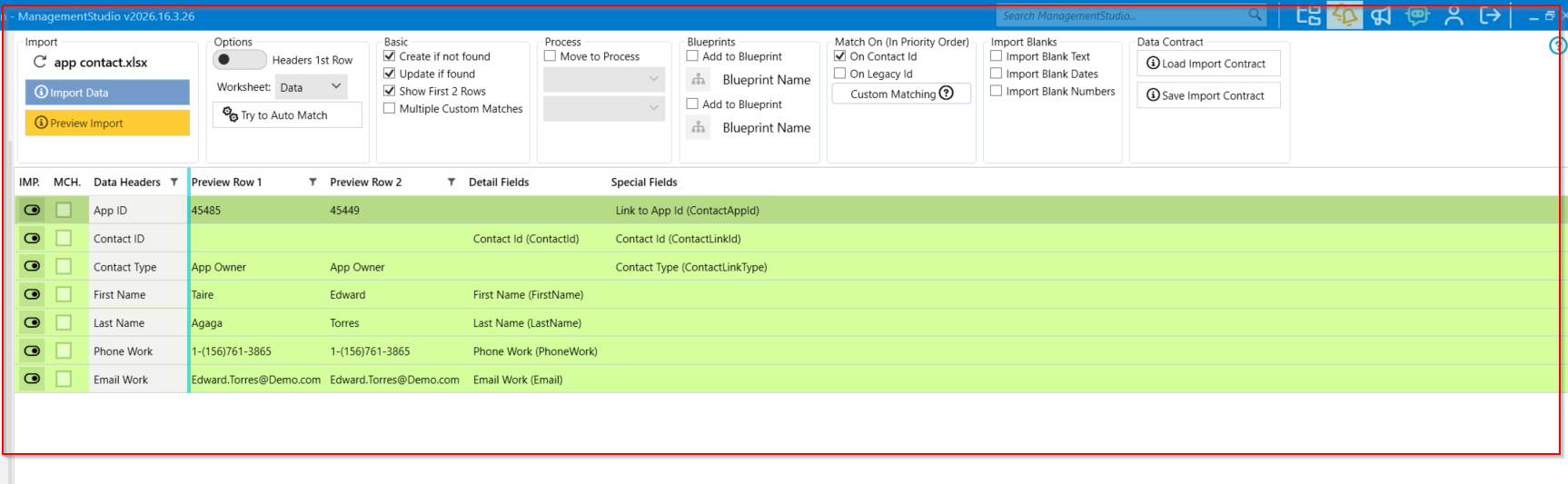 Note: Applications must exist in ManagementStudio before you can associate contacts with them. If necessary, perform a two-step import: