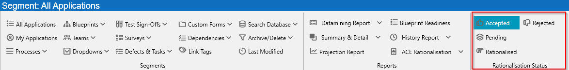 You can view applications by Rationalisation Status from the ribbon in the Applications module.