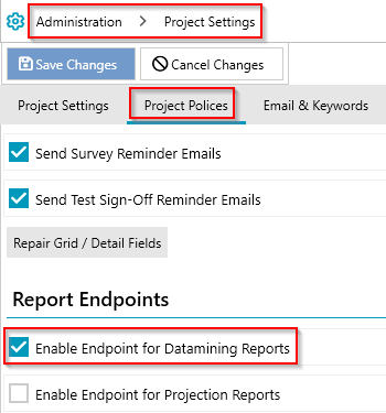 To access Datamining Reports via an endpoint, you must enable this setting in the source project.
