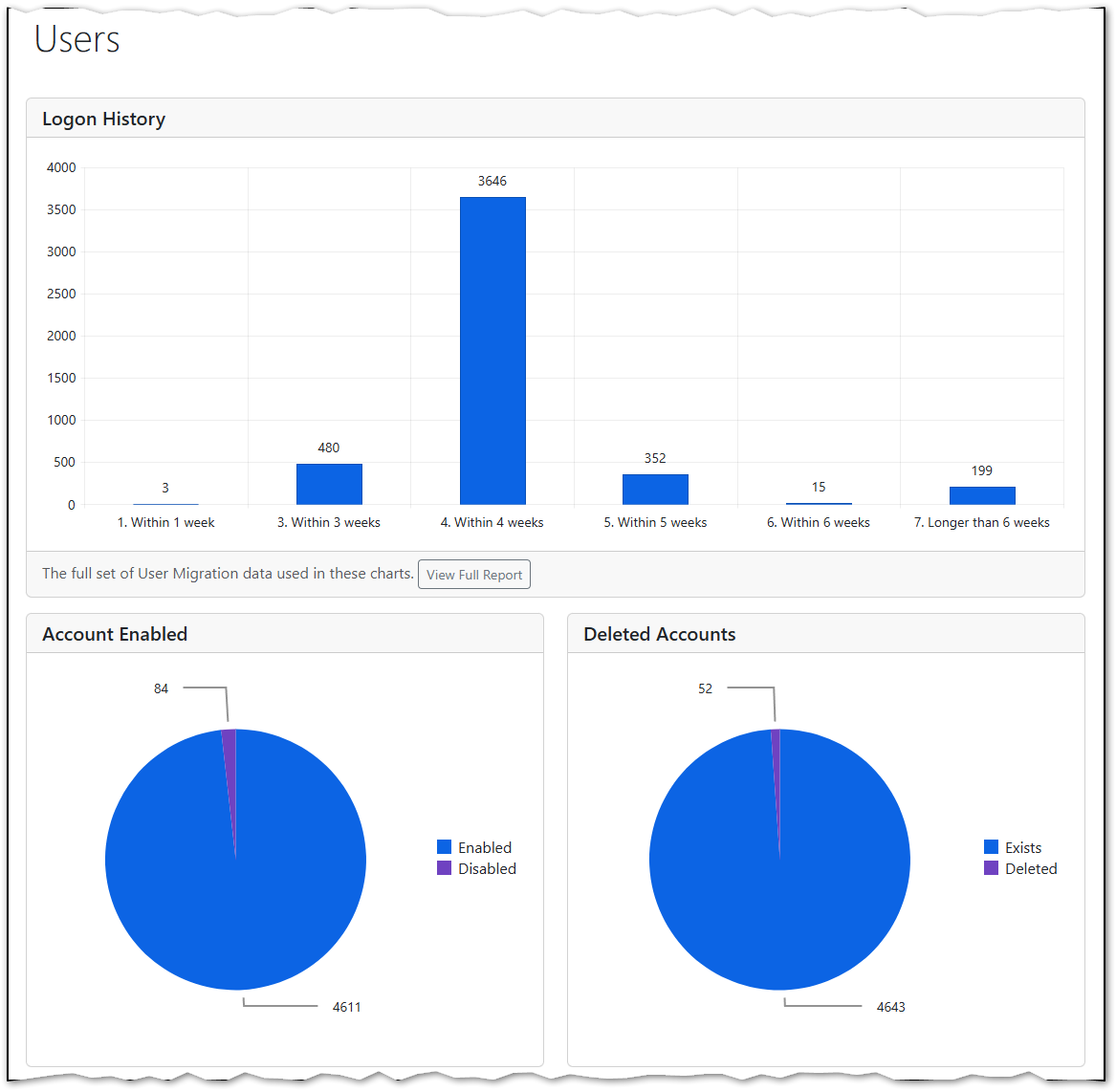 The Users section details account activity, including logon history, active vs. deleted accounts, and overall user presence across systems, supporting security posture and user lifecycle governance.